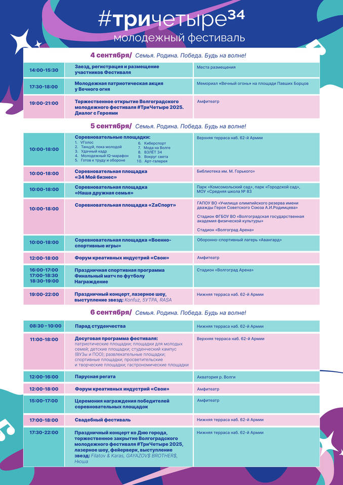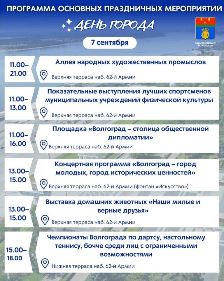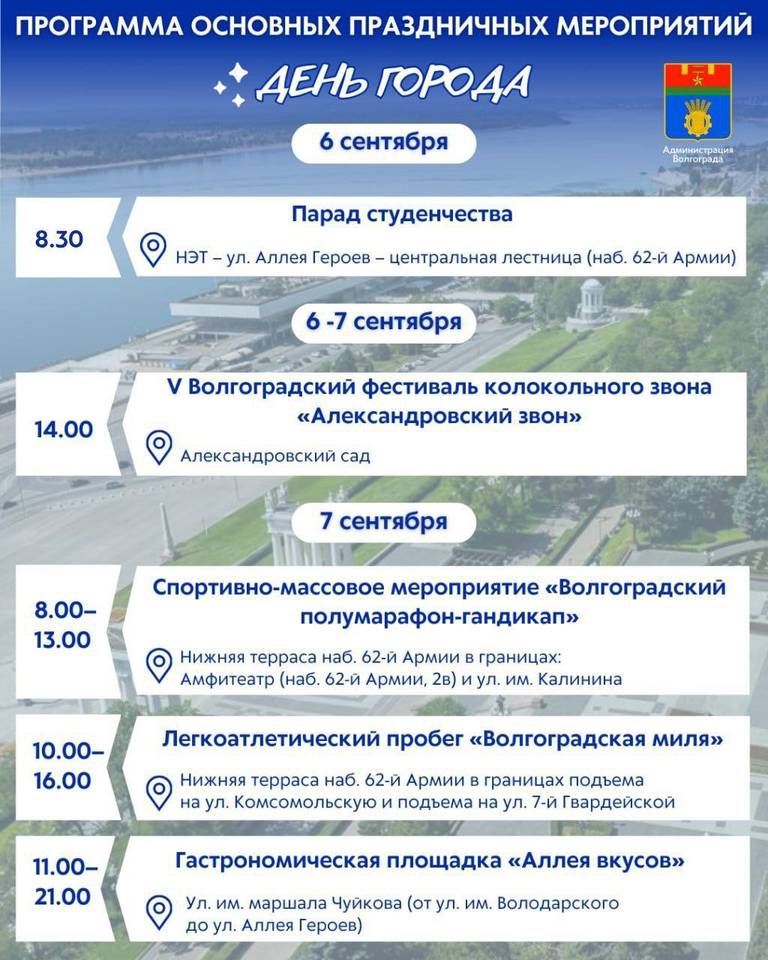 Программа мероприятий, приуроченных к 436-й годовщине основания Волгограда, следующая: