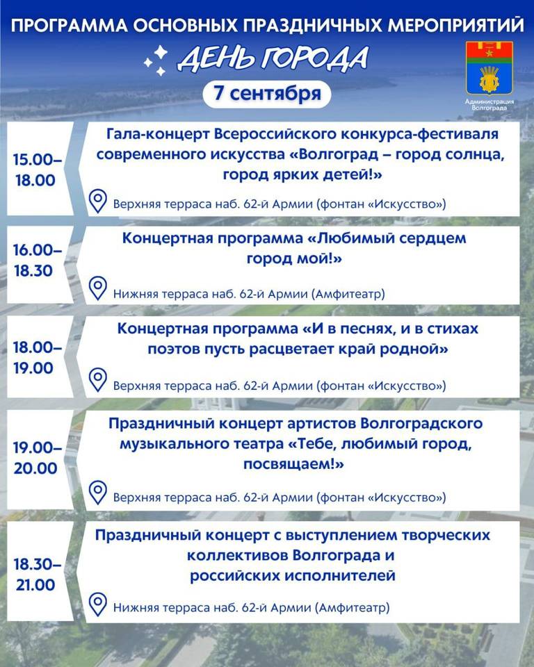 - 18:30-21:00: праздничный концерт с выступлением творческих коллективов Волгограда и российских исполнителейНижняя терраса наб. 62-й Армии (Амфитеатр).