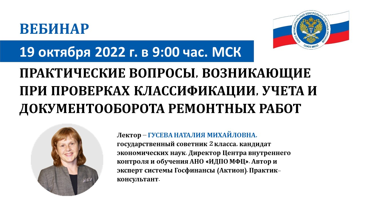 19 октября 2022 г. в 9:00 час. по московскому времени состоится первый вебинар внешнего эксперта в рамках обучающих мероприятий Союза муниципальных контрольно-счетных органов при поддержке Счетной палаты РФ. Тема: «Практические вопросы, возникающие при проверках классификации, учета и документооборота ремонтных работ».