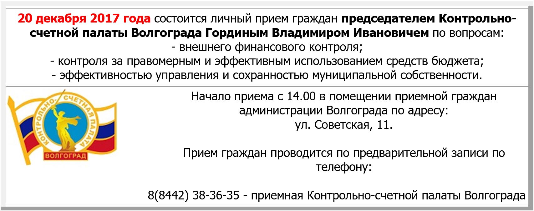 20 декабря 2017 года состоится личный прием граждан председателем Контрольно-счетной палаты Волгограда Гординым Владимиром Ивановичем